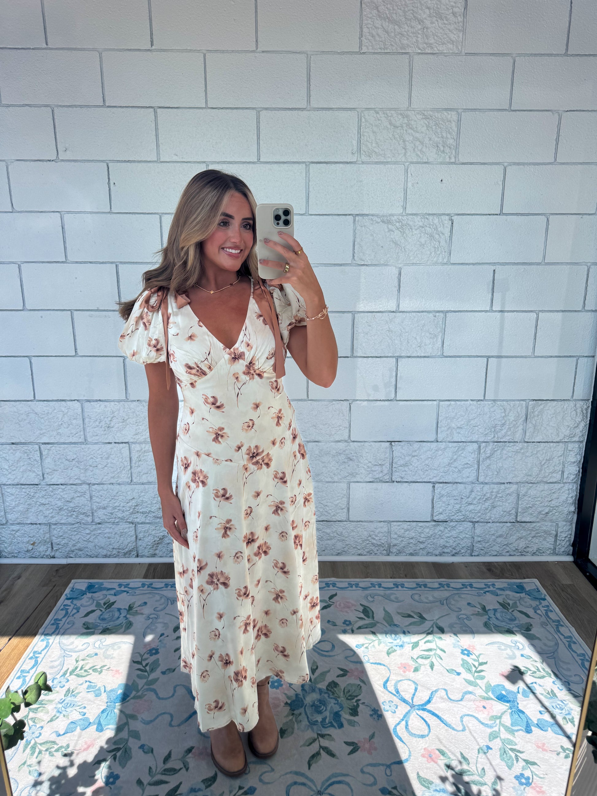 The Maple Honey Dress offers a graceful blend of elegance and charm with its cream brown silk fabric and delicate floral pattern. Its puff sleeves are enhanced with sweet ties, creating an irresistibly darling look. Designed in every flattering way, this dress is perfect for adding a soft, sophisticated touch to your wardrobe. I am wearing a size medium!