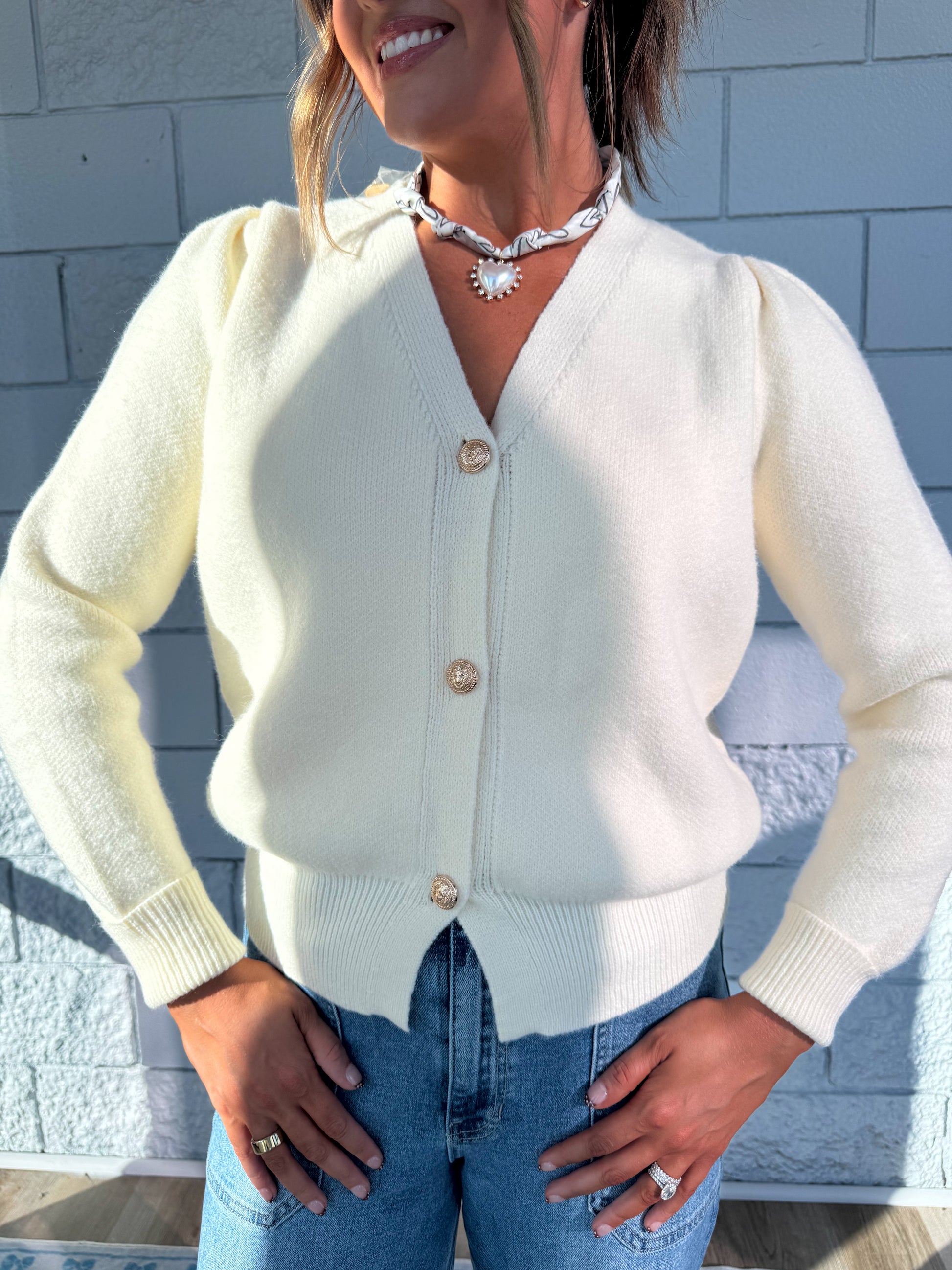 Introducing our Morning Latte Cardigan, a perfect addition to your wardrobe! This cream v neck cardigan features beautiful gold buttons for a touch of elegance. Stay warm and stylish while sipping your morning latte, or dress it up for a night out. Elevate your look with this must-have piece!