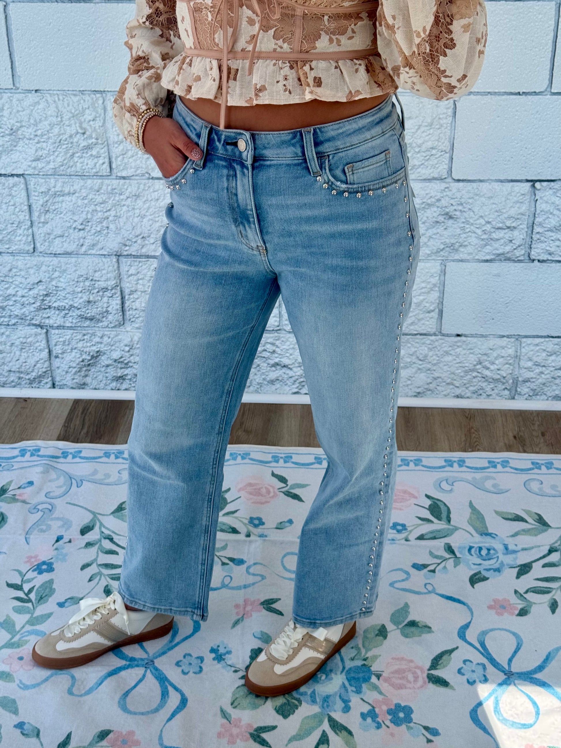 The Pearl Snap Jean combines a high-rise fit with a slim wide ankle cut, accented by stylish nail head details for a distinctive touch. Featuring the flattering and unique color "Honorable," this jean is the perfect choice for fall, gameday, and effortless year-round style. Designed to keep you looking sharp and feeling confident, it’s a must-have addition to your wardrobe. I am wearing a size 29!