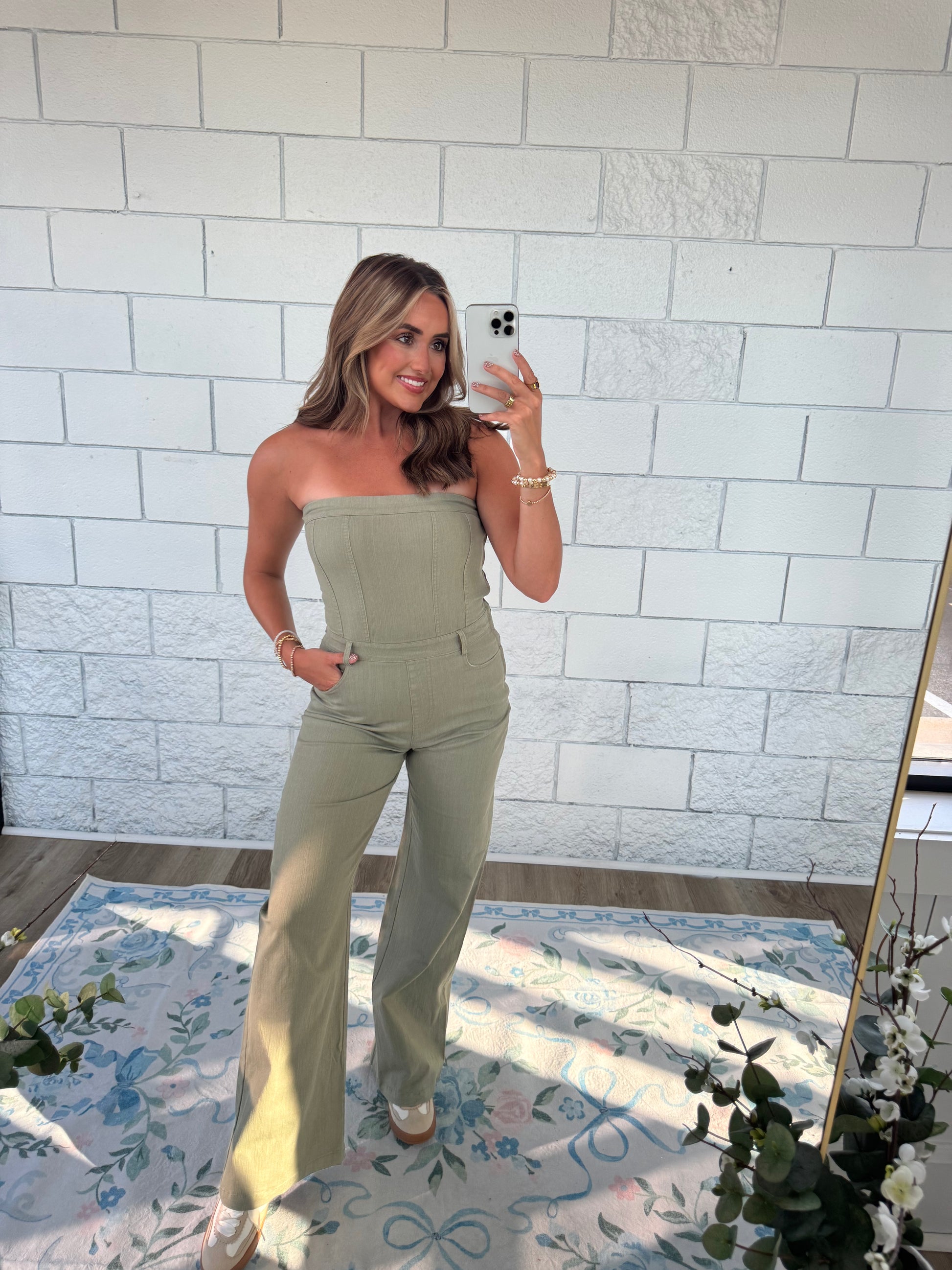 Elevate your fall wardrobe with the Spend My Dollar Jumpsuit. Its olive tone and strapless design offer effortless style and comfort, perfect for crisp autumn days and evenings. This jumpsuit combines chic appeal with easy wearability, making it your go-to choice for seasonal outings and cozy gatherings. I am wearing a size medium!