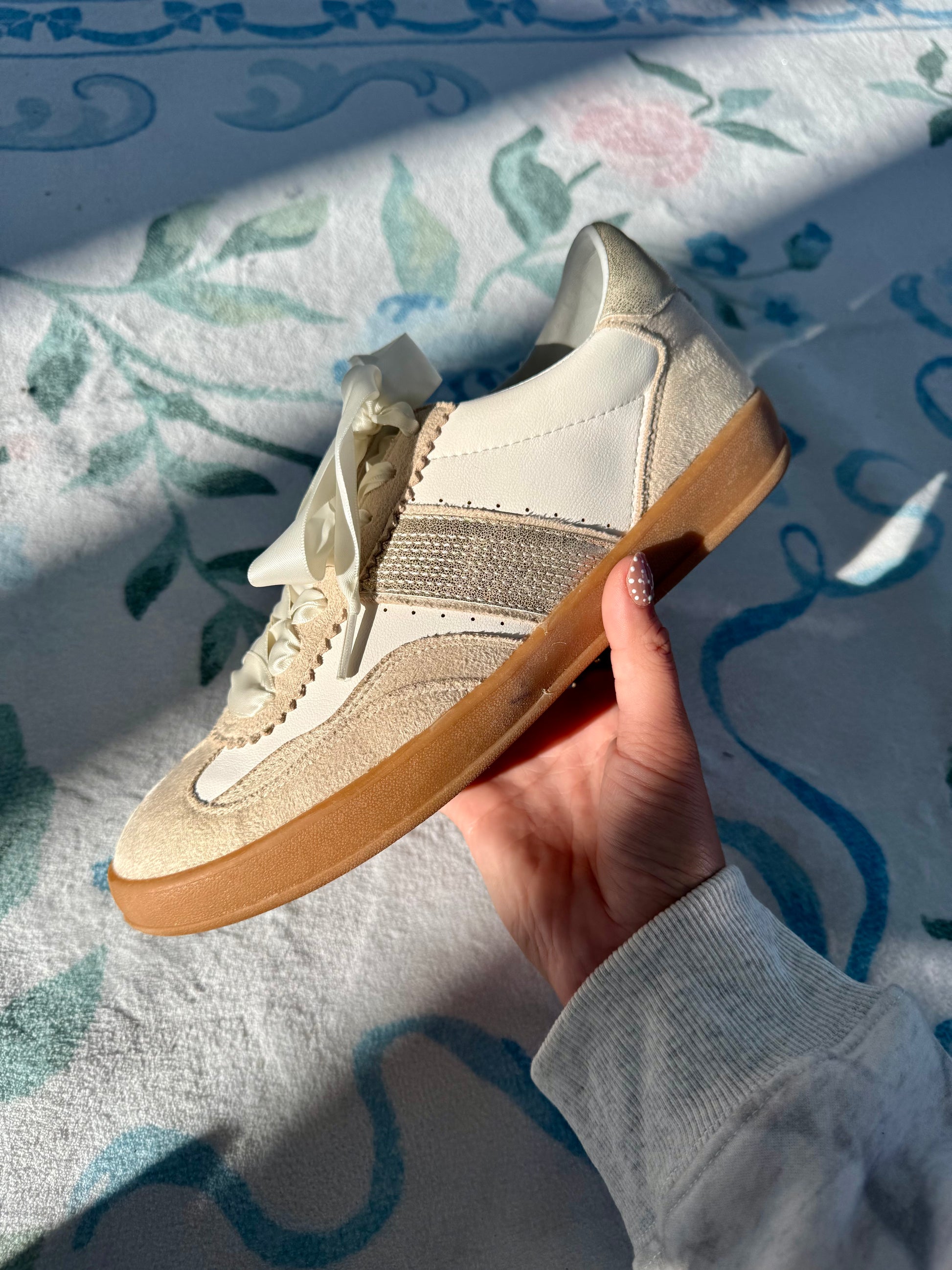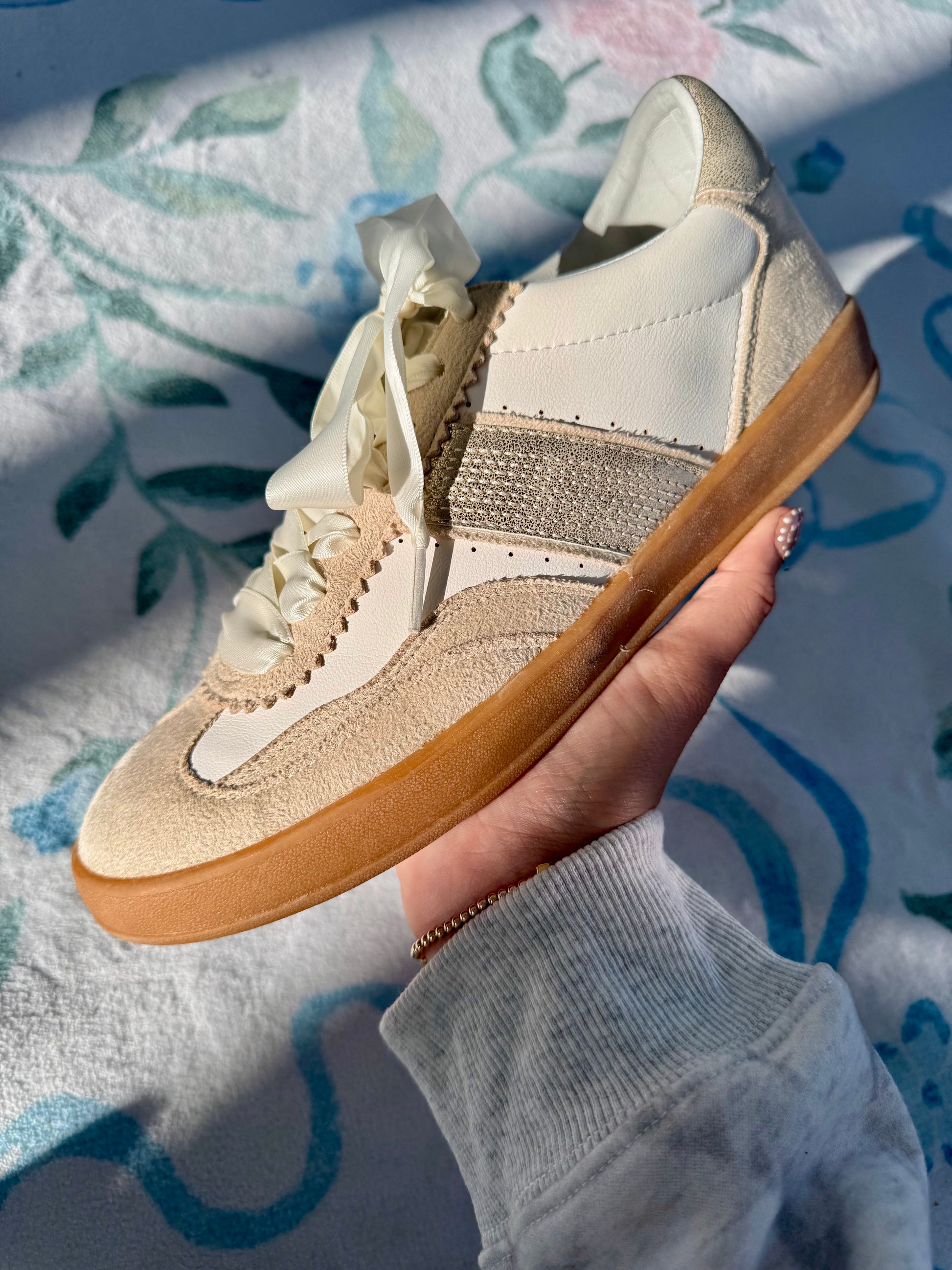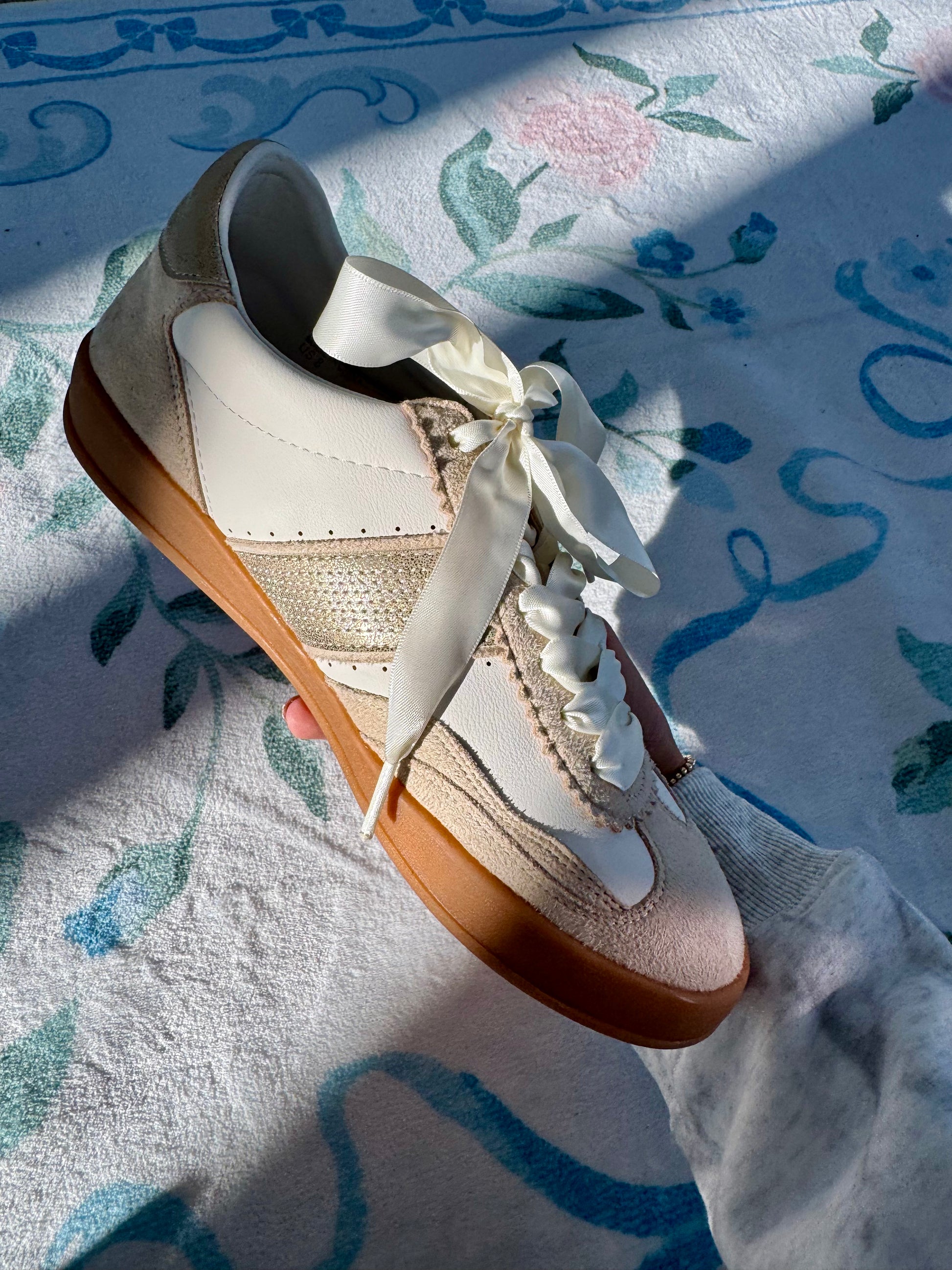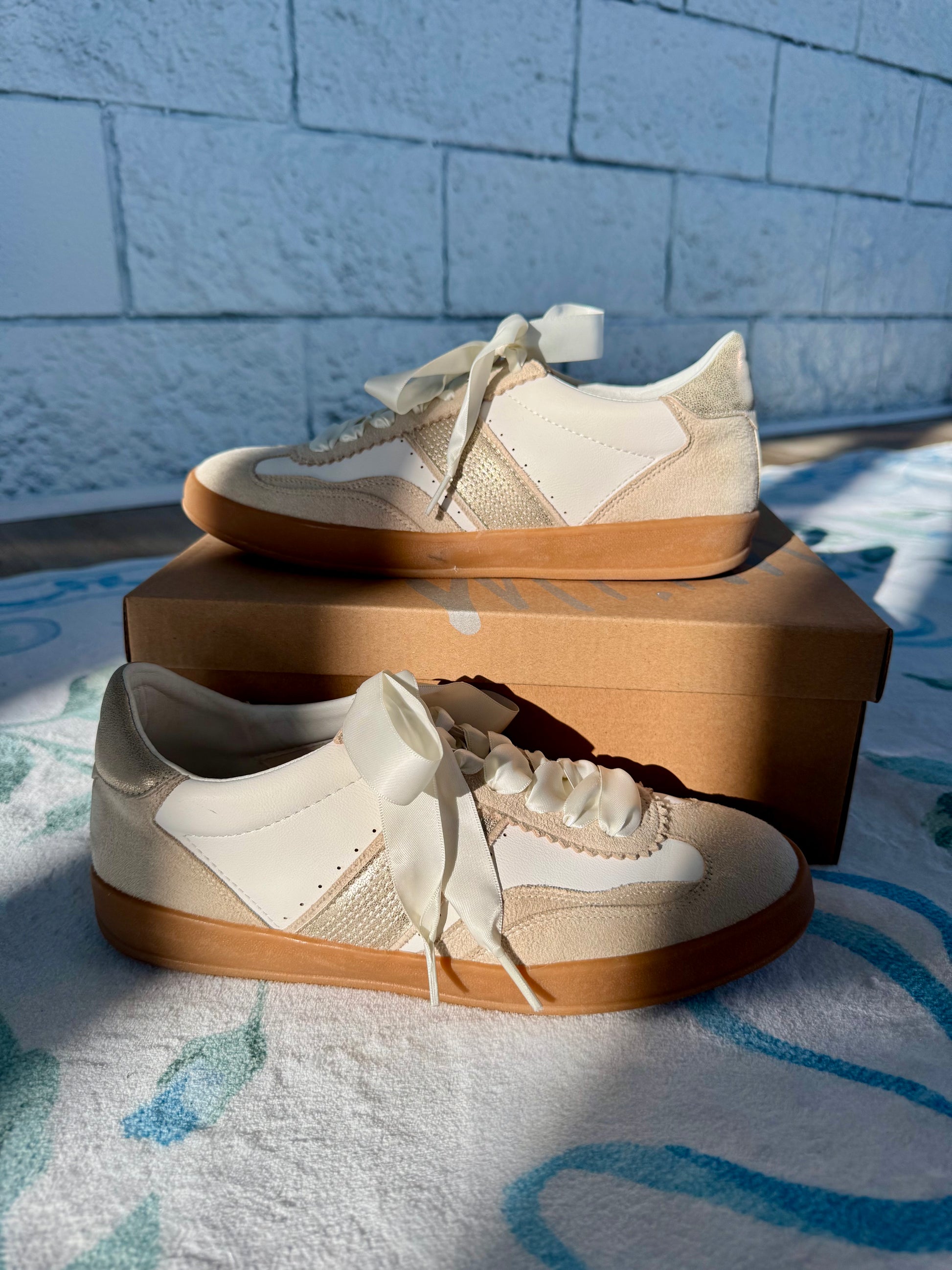 The Sweet Sneak beige-gold sneaker combines style and versatility for your everyday wardrobe. Its neutral colors effortlessly match any outfit, making it the perfect choice for daily wear. Enjoy comfort and a chic look that keeps you ready for any occasion. I am a size 8, but in these sneakers I am a 7.5. Shoes also come with ribbon or regular laces!