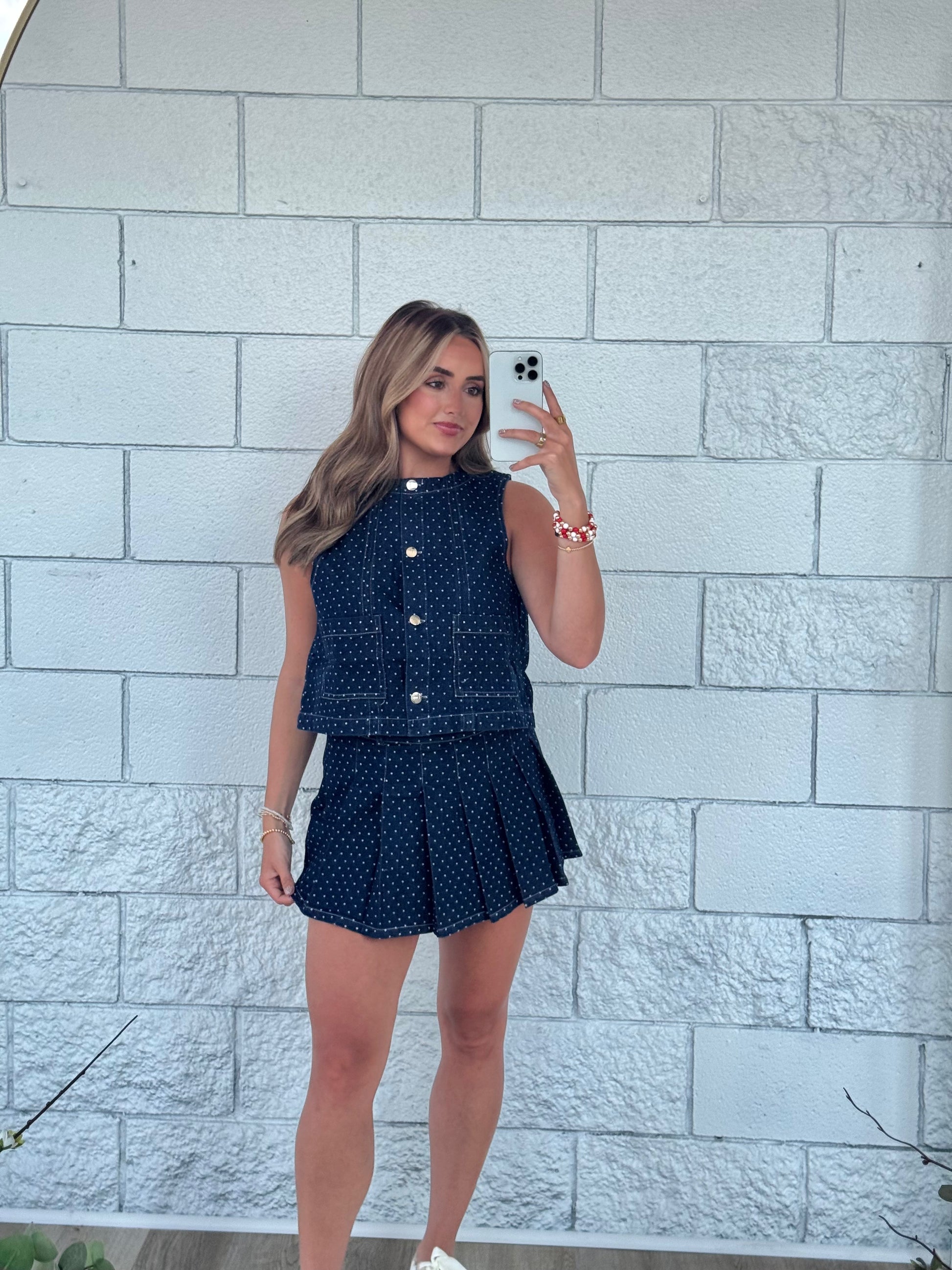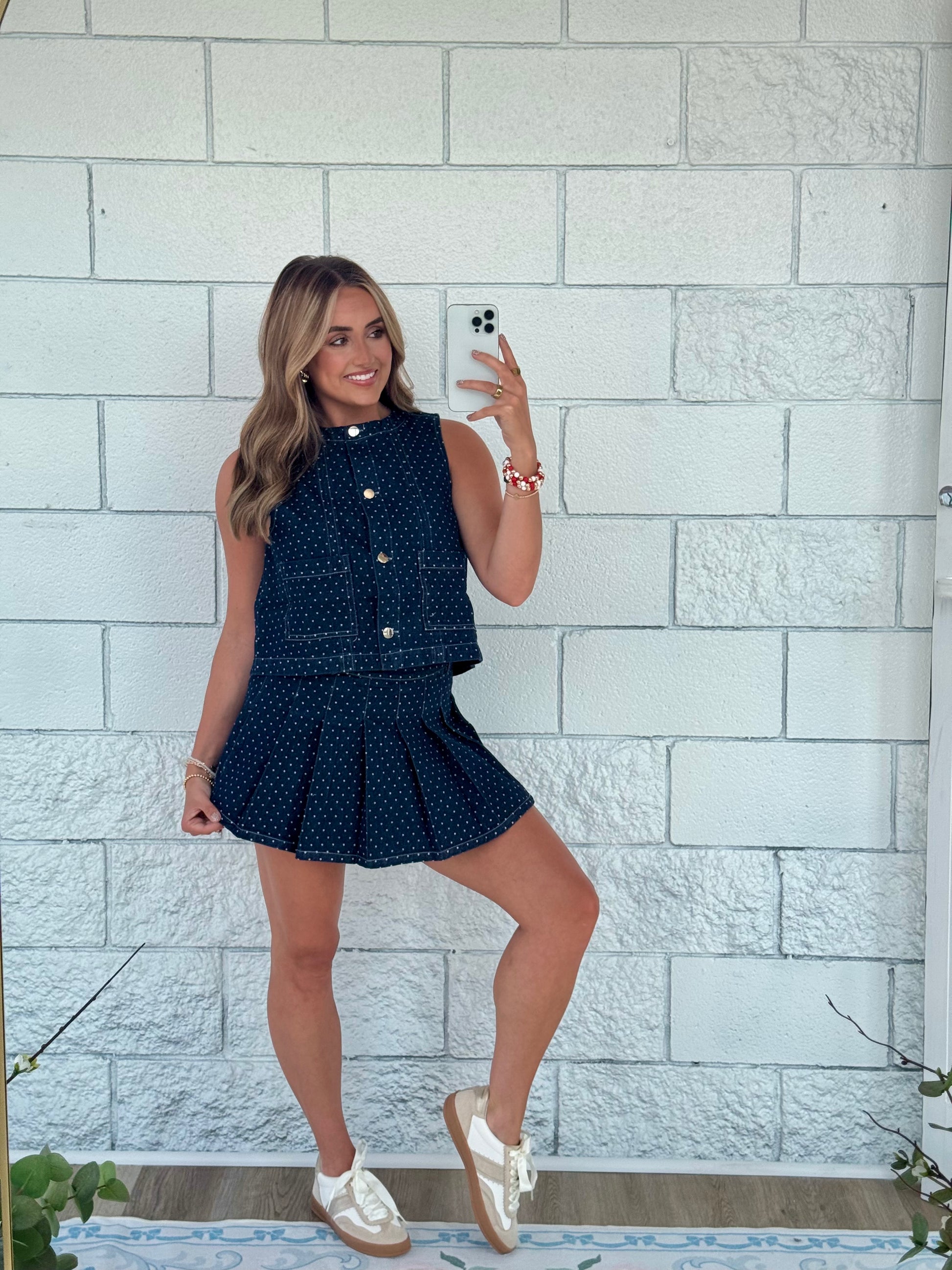 Elevate your game day style with the Title Town Set, featuring a playful pleated denim skirt and a charming sleeveless matching top. This coordinated outfit is designed to keep you looking sharp and feeling comfortable, perfect for cheering on your team or attending any sports event. Add a touch of spirited fashion to your wardrobe and make every game day your best yet. I am wearing a size medium!