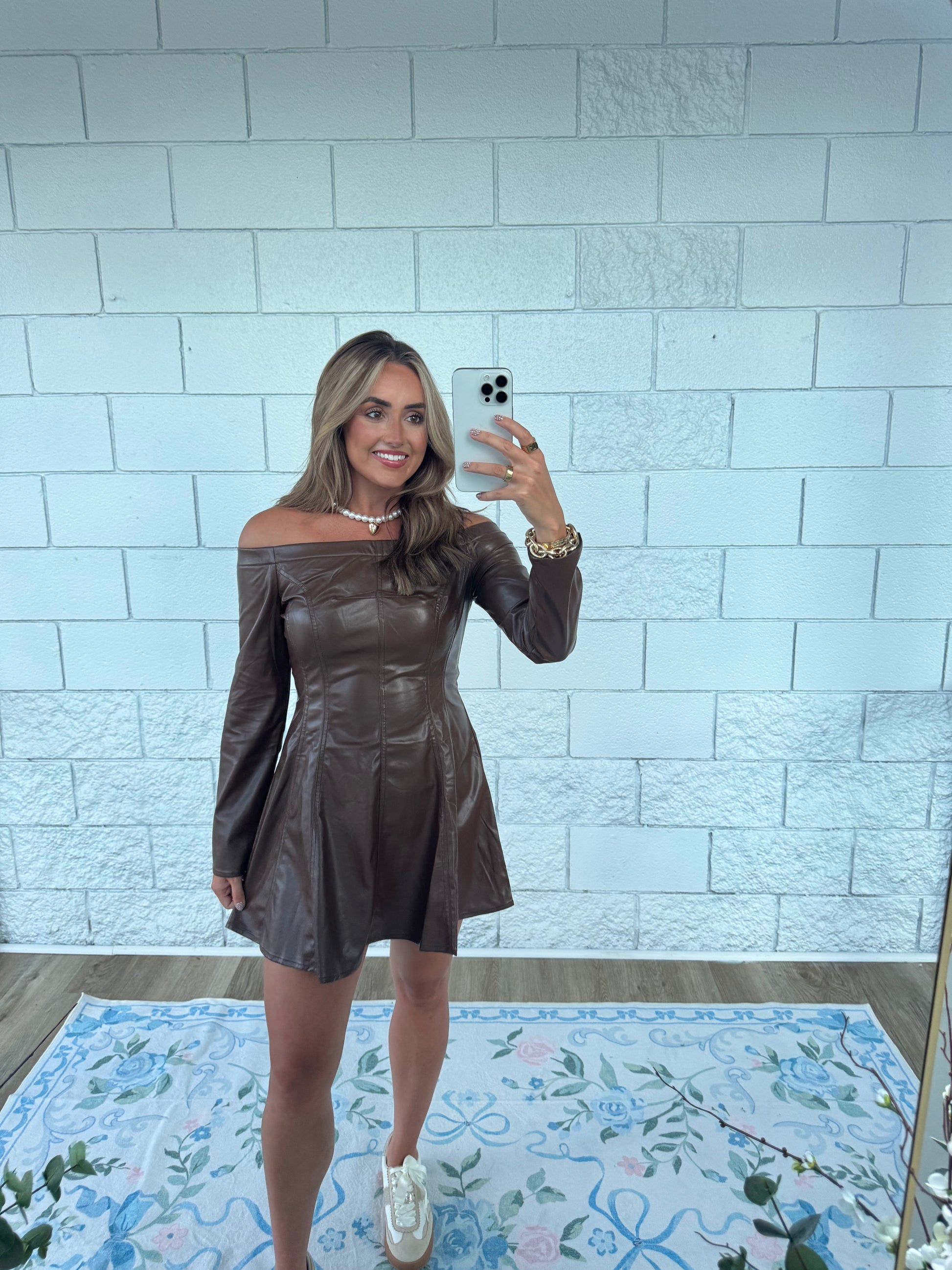 Elevate your holiday style with the Willow Dress, a strapless brown pleather piece designed to turn heads. Perfectly suited for crisp fall weather, its sleek texture adds a modern edge while keeping you comfortable. This dress effortlessly combines festive flair with cozy sophistication, making it an essential addition to your seasonal wardrobe. Embrace warmth and style in one chic choice. I am wearing a size medium!